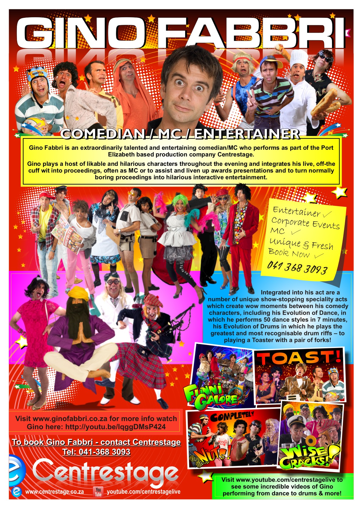 Funni Galore is Gino Fabbri and Donna Africa’s latest all-new package of laughter which pokes fun at the crazy characters who inhabit our multi-cultural, multi-lingual melting pot that is our South African society.